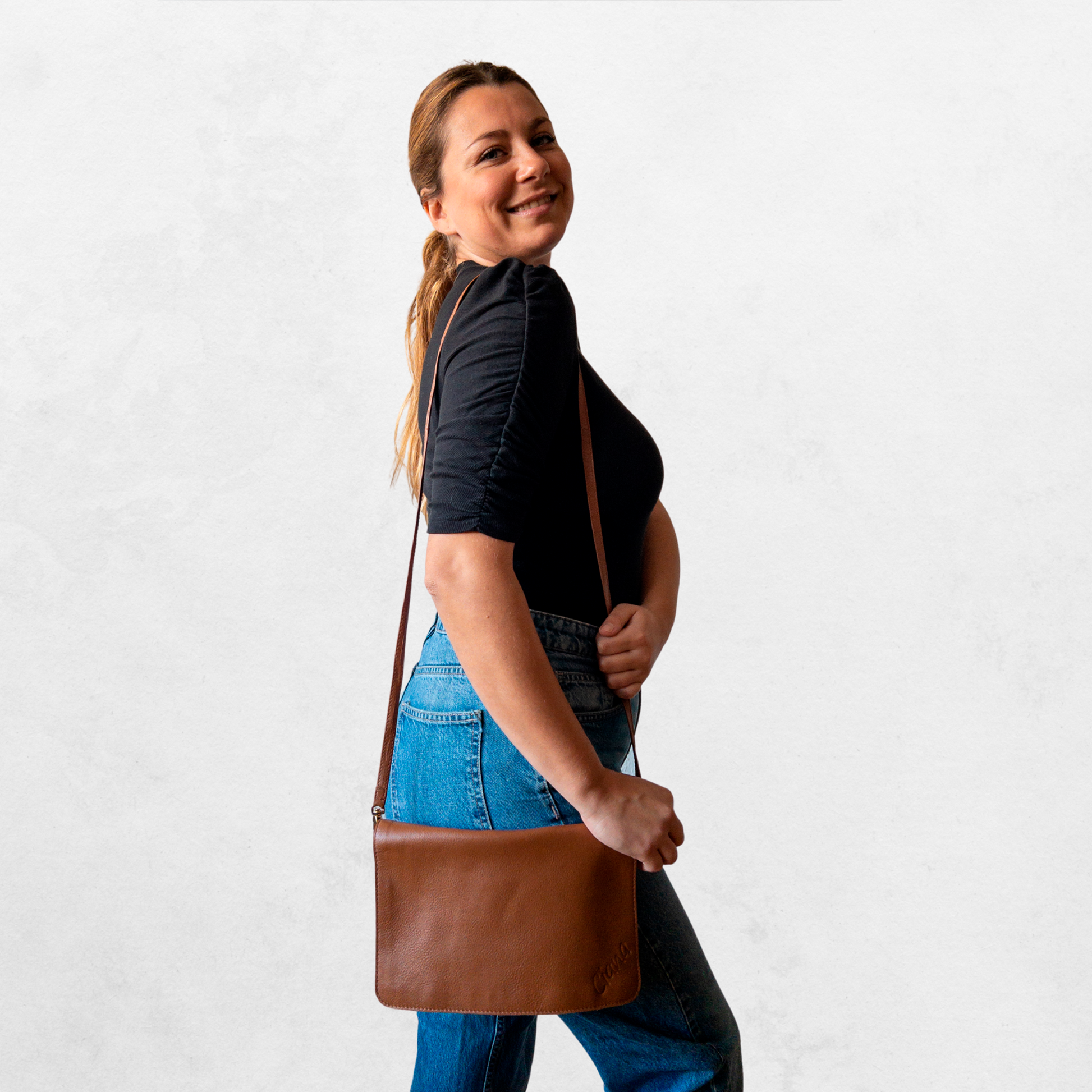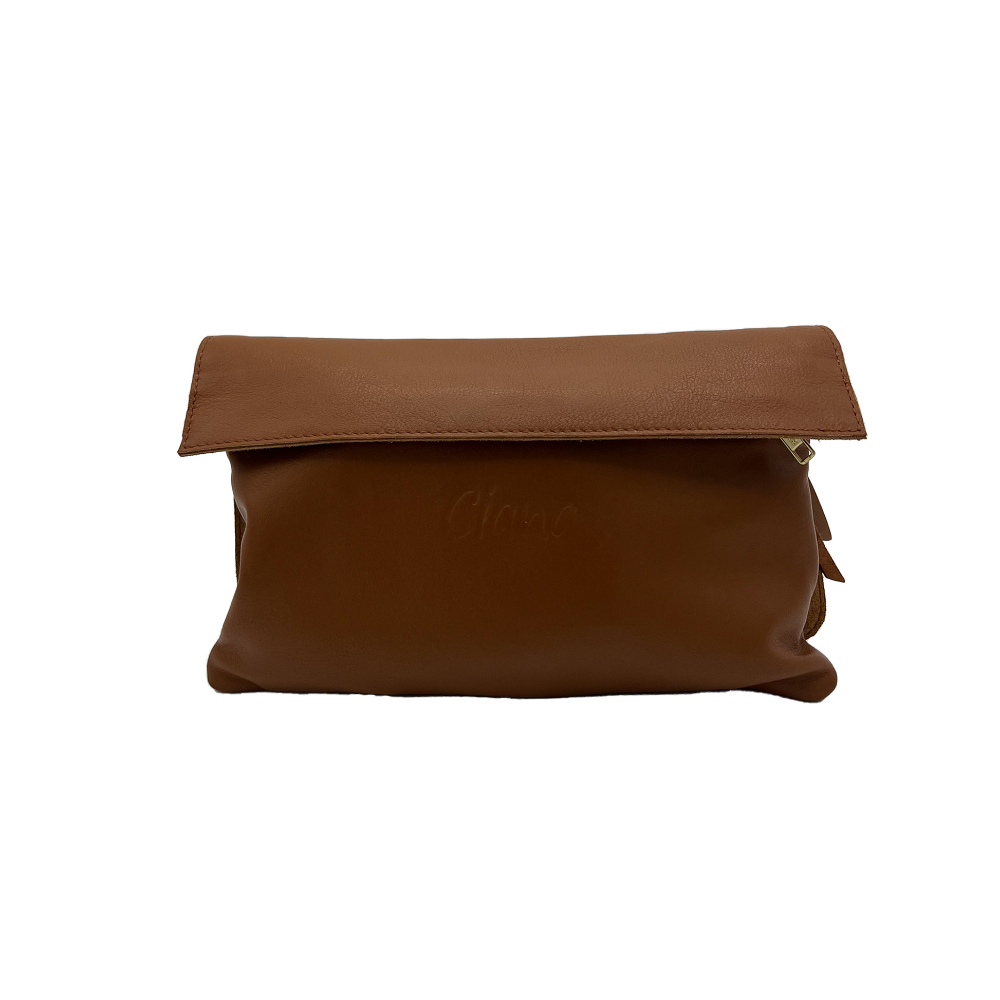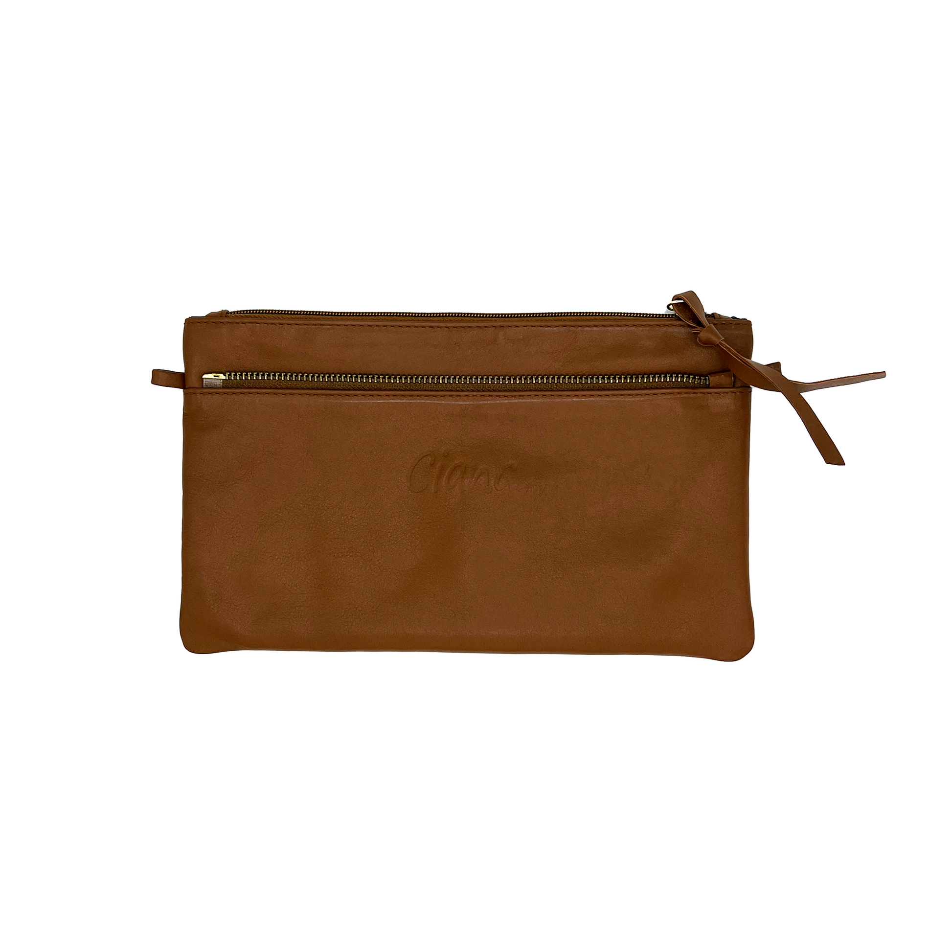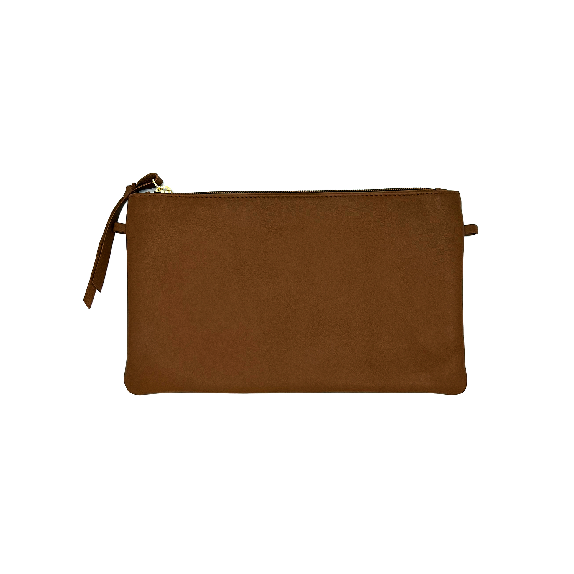 Detachable long leather strap to be worn over the shoulder or across the body plus a detachable leather wrist strap. Fully lined with an interior zipped pocket and two drop pockets.