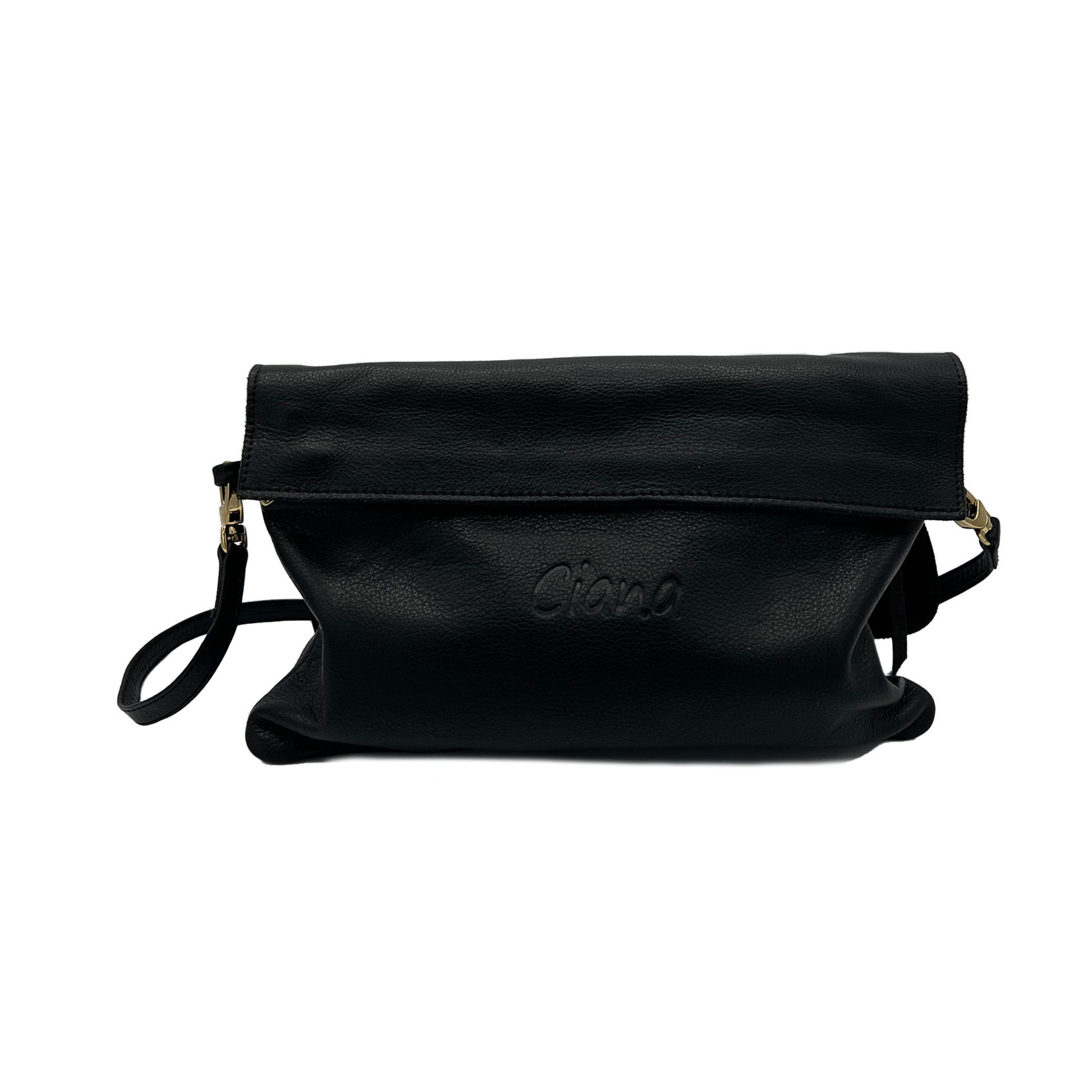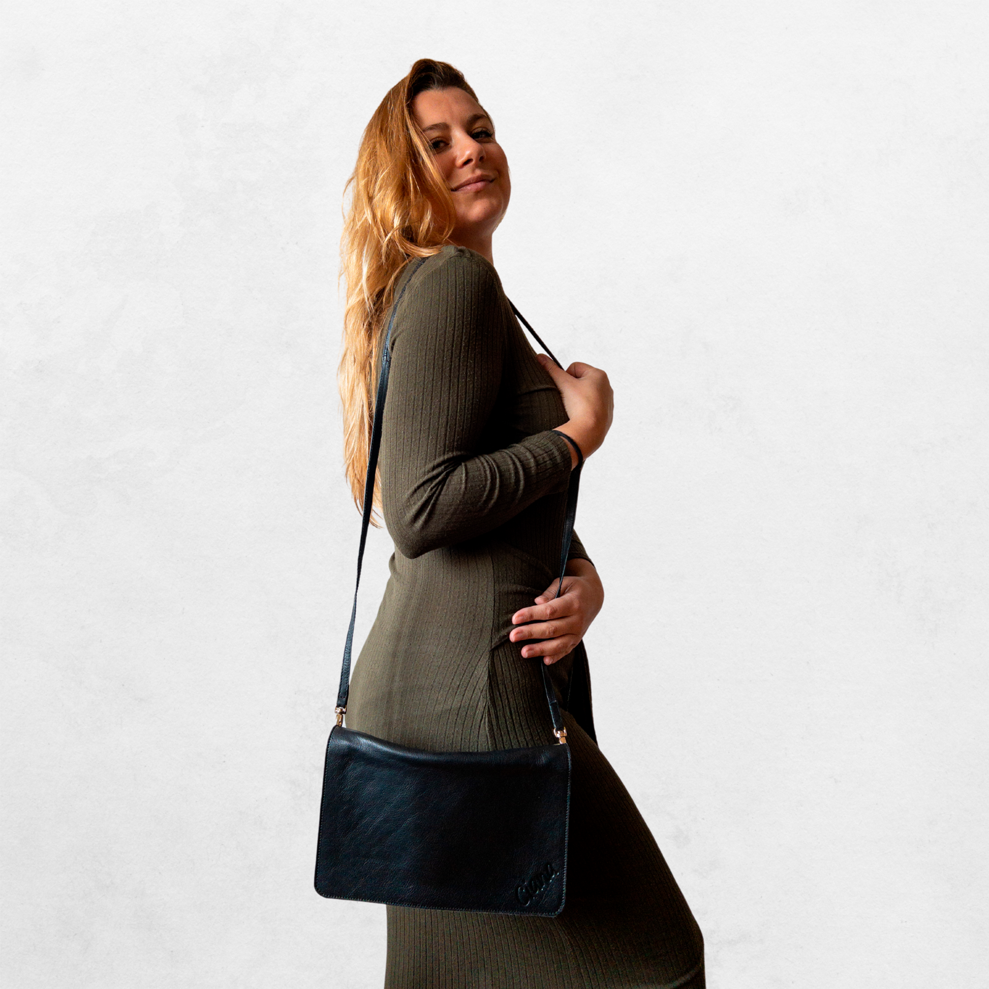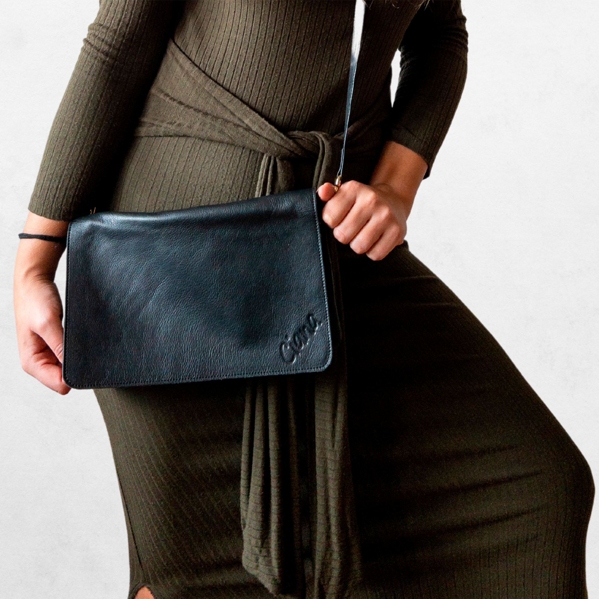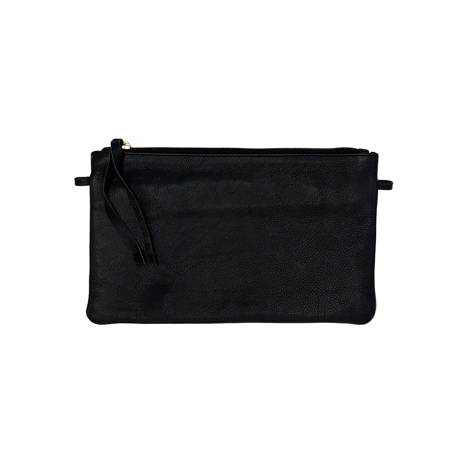 Detachable long leather strap to be worn over the shoulder or across the body plus a detachable leather wrist strap. Fully lined with an interior zipped pocket and two drop pockets.