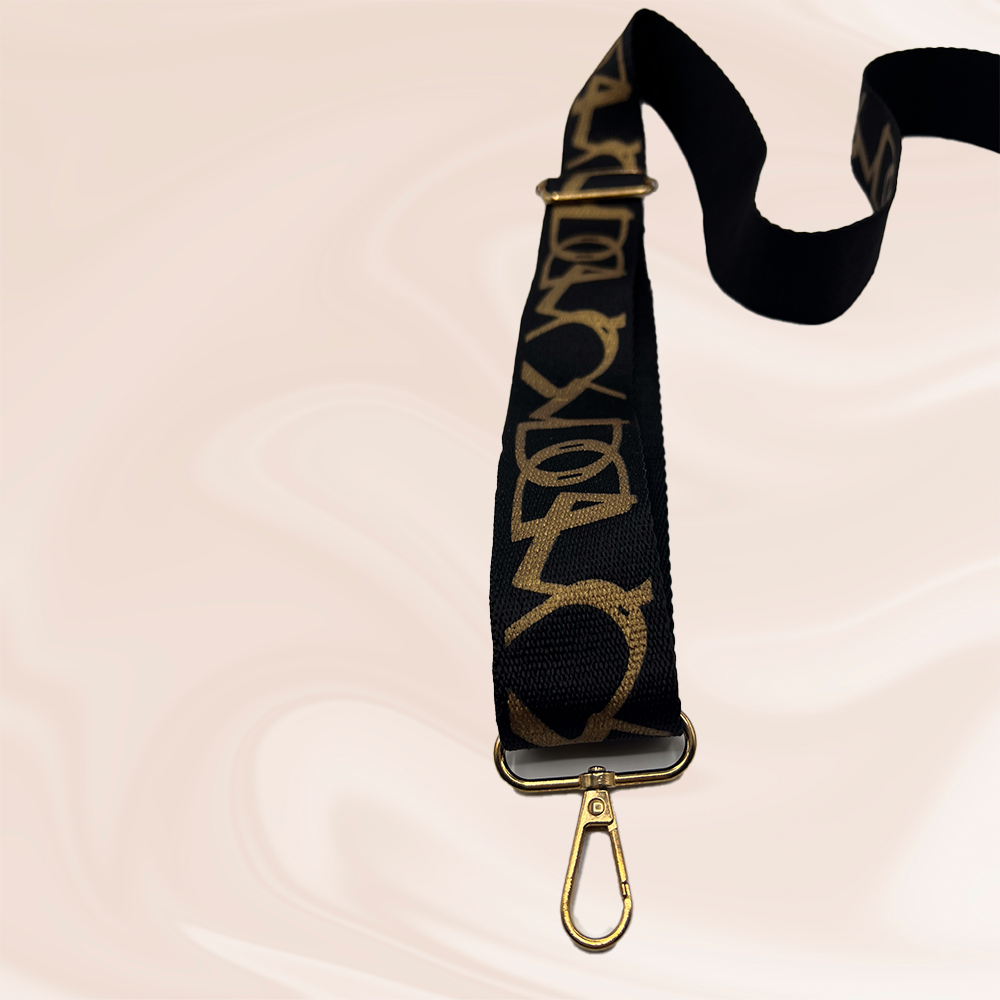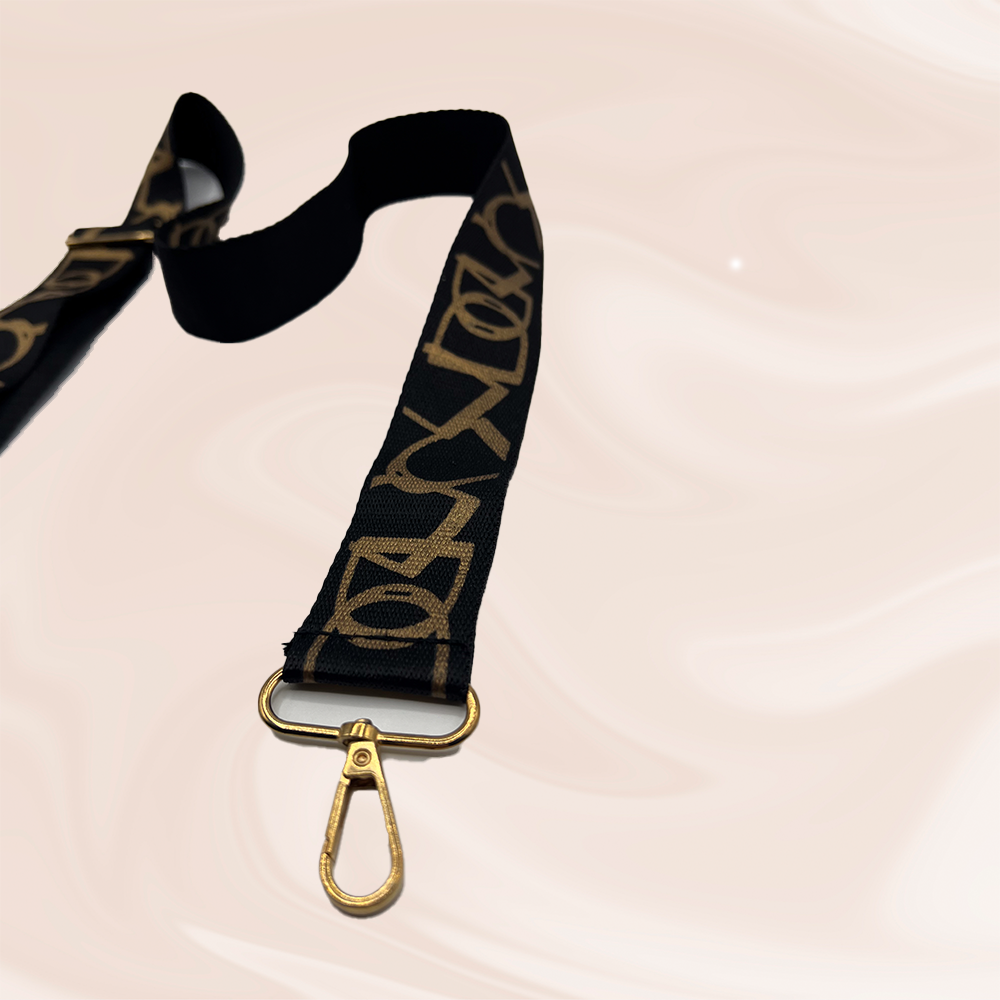 Enhance the aesthetics of your handbag with our fashionable black nylon strap adorned with elegant gold lettering. Measuring 125cm in length and 3.5cm in width, this adjustable strap adds a touch of sophistication to complement your bag.