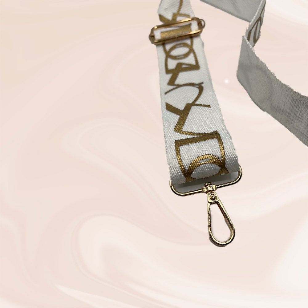 Enhance the aesthetics of your handbag with our fashionable white nylon strap adorned with elegant gold lettering. Measuring 125cm in length and 3.5cm in width, this adjustable strap adds a touch of sophistication to complement your bag.